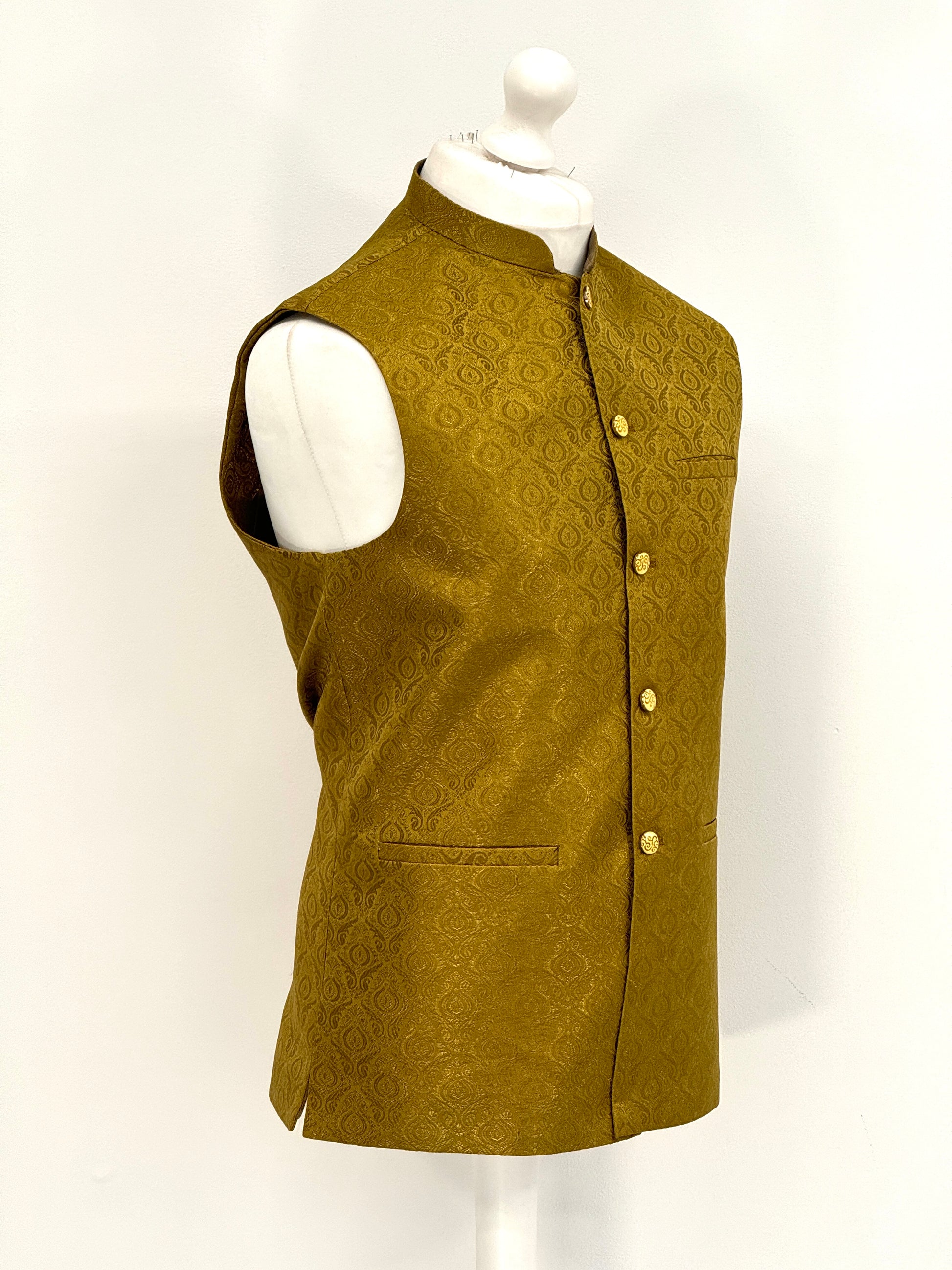 Introducing our exquisite Men's Mehndi Green Jamawar Waistcoat, a luxurious addition to any gentleman's wardrobe. Handcrafted from the finest quality Mehndi Green Jamawar fabric, this waistcoat is fully lined for added comfort. Featuring a timeless design, it comes with silver and black buttons that add a touch of elegance to any outfit. The waistcoat also comes with pockets, providing ample storage space for your essentials. Perfect for formal occasions, this waistcoat is sure to make a statement and impress all those around you.